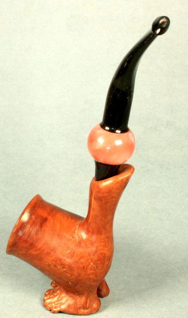 A fine smoker sculpted from a Ceanothus burl. His expression is a claim that he was born of fire.